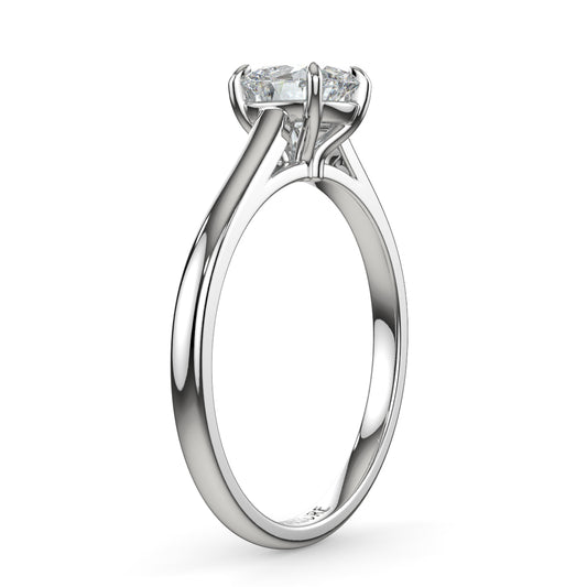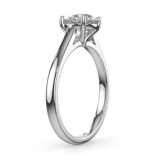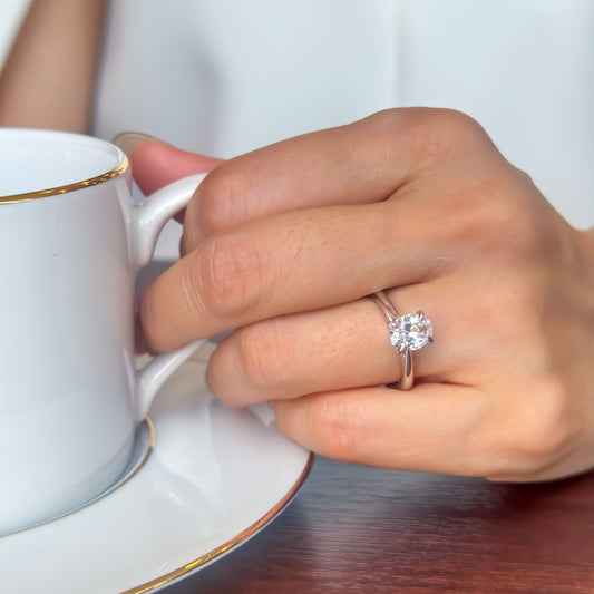 经典戒指,配有简单的单颗钻石和精致的戒圈。蒂芙尼镶嵌允许光线从侧面射入。