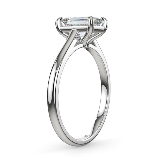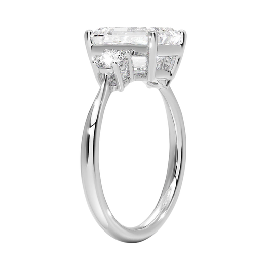 両サイドに存在感あるエメラルドカットダイヤをあしらった、ダイヤの華やかさを際立たせた婚約指輪