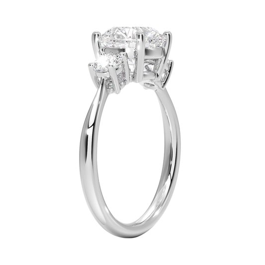 両サイドに存在感あるラウンドカットダイヤをあしらった、ダイヤモンドの華やかさを際立たせた婚約指輪